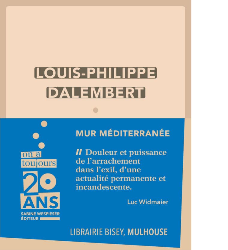 Partager sur : Site de la librairie Page facebook Page InstagramLIBRAIRIE BISEY, MULHOUSE Mur Méditerranée Louis-Philippe DALEMBERT « Douleur et puissance de l’arrachement dans l’exil, d’une actualité permanente et incandescente. » Luc Widmaier