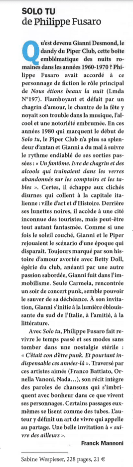 « Avec Solo tu, Philippe Fusaro fait revivre le temps passé et ses modes sans tomber dans une nostalgie stérile : « C’était con d’être punk. Et pourtant indispensable ces années-là ». Traversé par ses artistes aimés (Franco Battiato, Ornella Vanoni, Nada…), son récit intègre des paroles de chansons qui s’imbriquent avec bonheur dans ce que vivent ses personnages. Certains passages eux-mêmes se lisent comme des tubes. L’auteur y définit un art de vivre qui appelle au partage. Une belle invitation à « suivre des ailleurs ». »